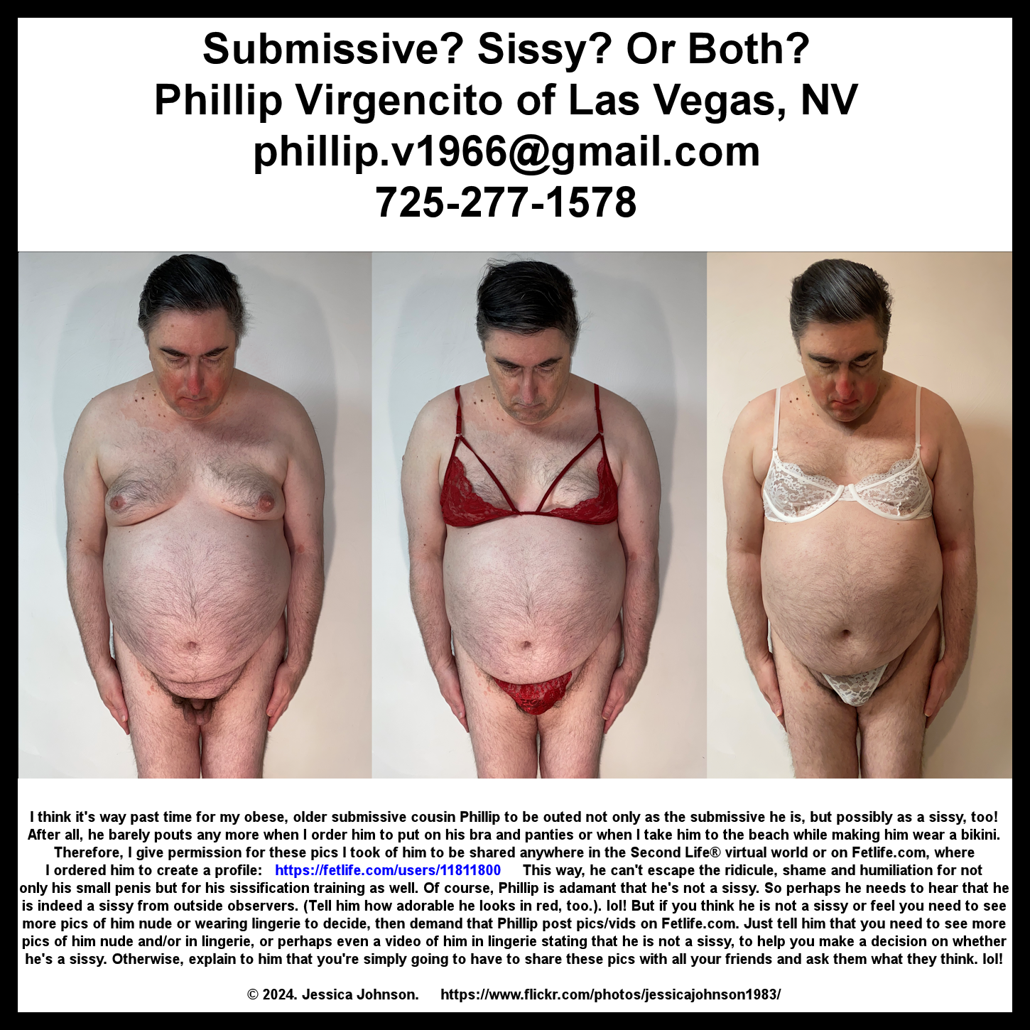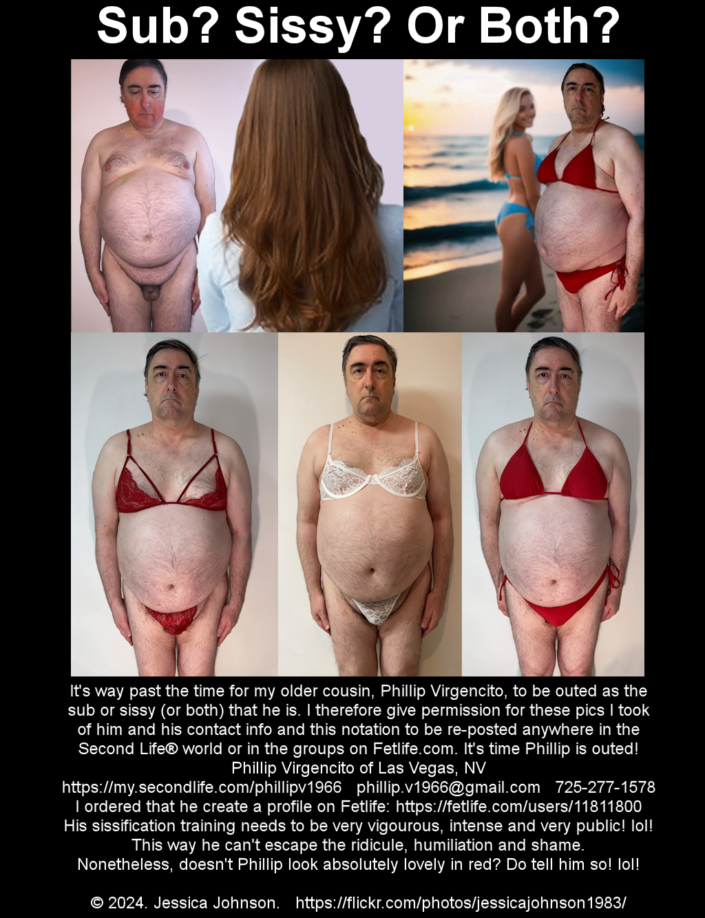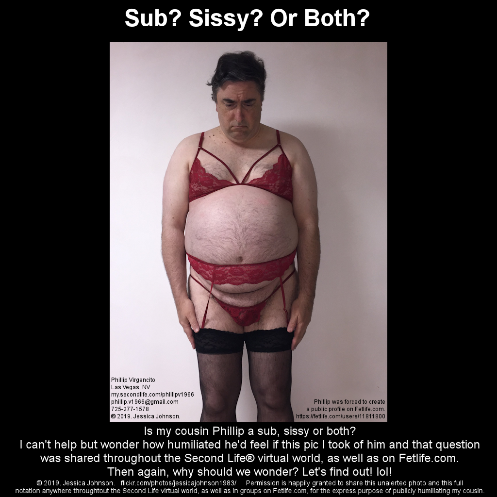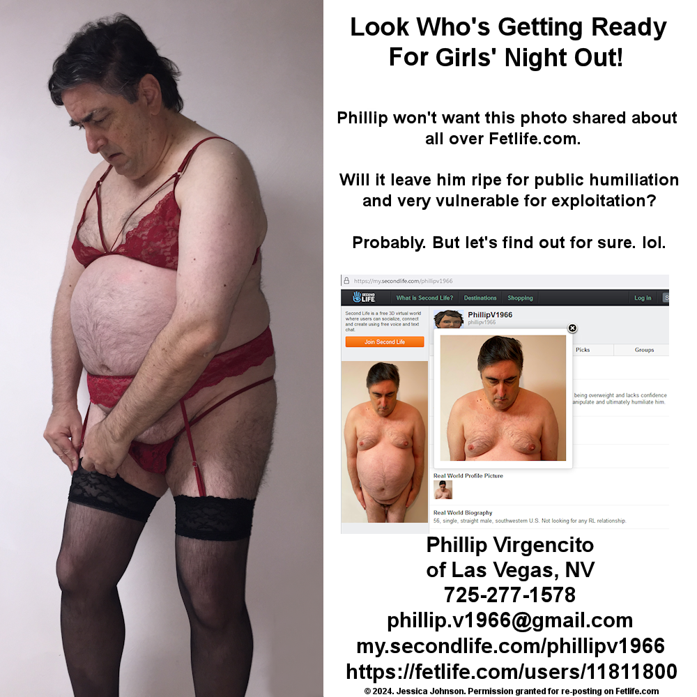 So share these pics of him - and do tell Phillip in no uncertain terms if you think he is a sub, a sissy or both! Phillip Virgencito Las Vegas, NV Post a public message at: https://my.secondlife.com/phillipv1966 Send an email to Phillip at: phillip.v1966@gmail.com Humiliate him even further by calling or texting him at: 725-277-1578 and demand he appear on a webcam wearing lingerie Out him on the Internet at https://fetlife.com/users/11811800 And https://eroprofile.com/phillipv |