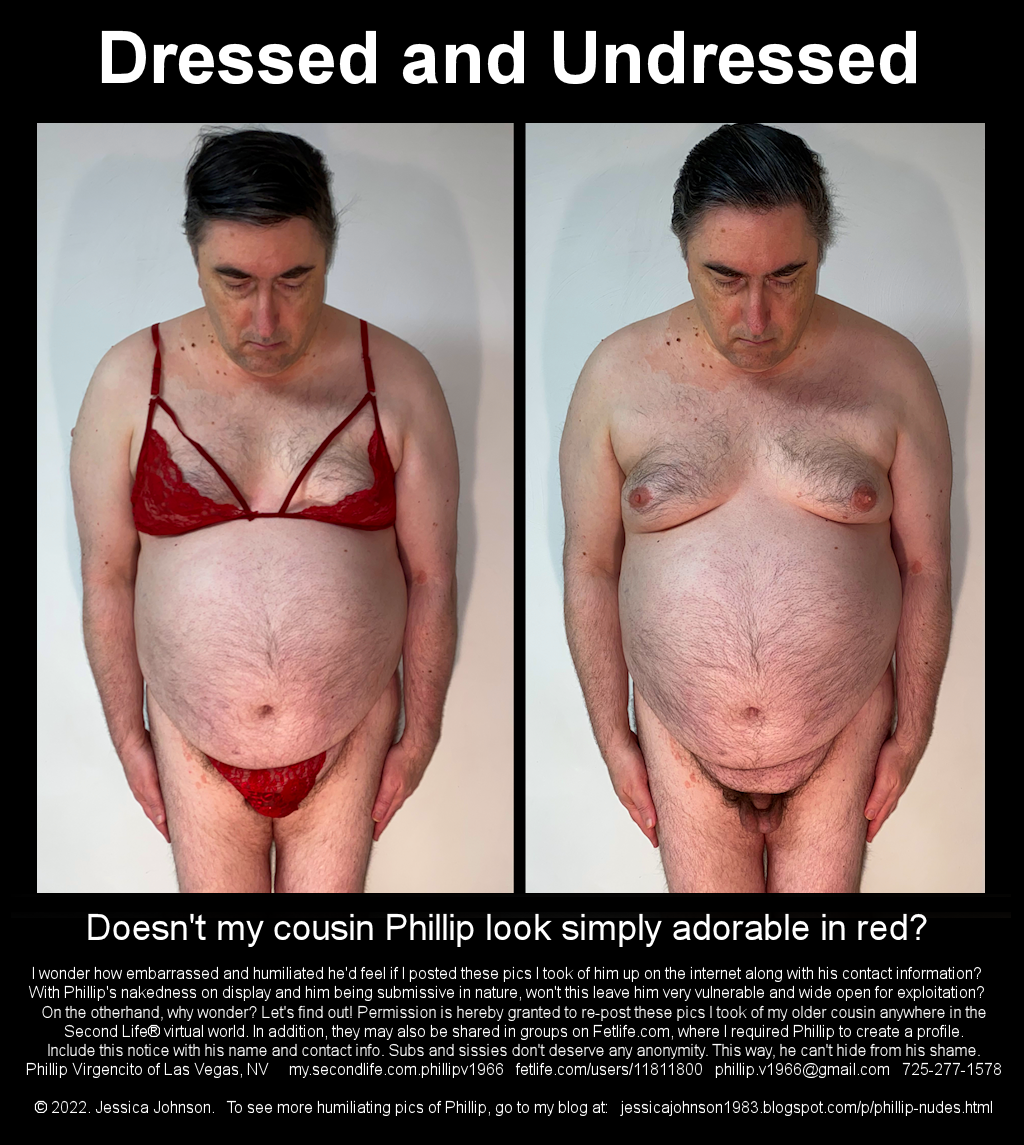 ![]() Jessica Johnson Why am I publicly humiliating and shaming my obese older cousin and posting nude pics of him on the net for everyone to see? How about simply because I can. LOL! I mean, come on! Phillip's so meek and submissive that I can routinely strip him naked and pin him into a diaper with only a weak, whiny protest from him. Sort of like an embarrassed pre-school boy would give his teenage babysitter about her seeing his tiny prepubescent penis at bath time. So really - does someone so emasculated like that deserve any modesty? I think not. And I think you agree. LOL! Of course Phillip hates being humiliated like this and wishes that I would stop publicly shaming him. But he also acknowledges that I have the right to do so, that he submitted to my authority, and that he accepts his fate. He is also so very ashamed to admit that he is so submissive, but that's what he is: a submissive. PagesArchivesSome of you already know that I put up nudes of Phillip on my Flickr account so that all his female relatives could see him naked - and did! LOL! But in doing, besides women who know Phillip, I also garnered about 150+ additional followers, including men who started sending me unsolicited dick pics. So I've since made most of Phillip's nudes viewable for friends & family only and deleted nearly all followers (it's nothing personal). Of course that's no reason why you all shouldn't be able to see much of what all Phillip's female relatives saw. LOL! I've made many of the nude pics of Phillip that I put up on Flickr public anyway, just for the heck of it. This pic of Phillip's micro-penis has reached over 6,600 views! LOL! Someone even put it up on Wikipedia as an example of a micro-penis. LOL! Well, that was O.K. because, unlike most of the other nude pics of Phillip (which are copyrighted by me and may NOT be used without permission), that one I had indicated people would be allowed to use. Not that Phillip showed any appreciation for me NOT allowing others to be used in a similar way. Others, like this nude one also showing his face, received a more modest total of views since only his female relatives saw them. Still, that's not much consolation for Phillip, I suppose. LOL! (add .png to the end of the URL to see the pic) Were you among the 6,800+ Flickr users who saw that Phillip is so obese that his already small penis is hardly visible under all that pubic area fat? But only his female relatives saw the shame on his face. (add .png to the end of the URL to see the pic; and left click on the pic to enlarge it) Of course, some pics of Phillip DRESSED, so to speak, can be considered even more hilarious than those of him nude. Like this one, for instance. Doesn't he look adorable? (add .jpg to the end of the URL to see the pic) And just look at how badly Phillip is blushing. Can you imagine his shame if I published his full name and contact info so that women from all around the world could contact him and tell him what I said; that he looks "adorable" and should be required to be dressed like that all the time? For example, what if I posted his full name: Phillip Virgencito And his blog address: phillip-virgencito.blogspot.com And his email: phillip.v1966@gmail.com And his Las Vegas, NV phone number: 725-277-1578 Might he feel a tad bit embarrassed? Ooops! Did I just type all that instead of merely thinking it aloud. Oh, well. I guess that is going to kind of suck for Phillip. C'est la vie. ![]() LinksEmily's Blog He shouldn't have called her a "bitch" Small Penis Ashamed Search phrase leads to Phillip nude! LOL! Naked Ashamed Obese Male Phillip naked is the search result! LOL! Phillip's Small Penis Humiliation... Where it says, "I want to search the archive for saved snapshots", type in: visualhunt.com phillip small penis Internet ArchivePhillip's Permanent Shame Not even I can spare him from this everlasting humiliation. Phillip's Erectile Dysfunction Shame Just add 3/ to the end of the URL - LOL! Just add 44/ to the end of the URL - LOL! And when you see Phillip naked, right click 'open image in new tab' to enlarge his humiliation. LOL! Just add +Humiliation to the end of the URL and see Phillip in all his blushing, naked glory. LOL! LOL! Just add xl to the URL and then left-click on the pic. LOL! Phillip Nude Pic #1 Look at the shame on his face! LOL! Phillip Nude Pic #2 Any wonder why he pees himself? LOL! Phillip Nude Pic #3 Isn't he obedient and submissive! LOL! Phillip Nude Pic #4 A penis this small belongs in diapers! LOL! Phillip Nude Pic #5 Small Penis Humiliation & Shaming Photographed Naked Humiliated Ashamed |